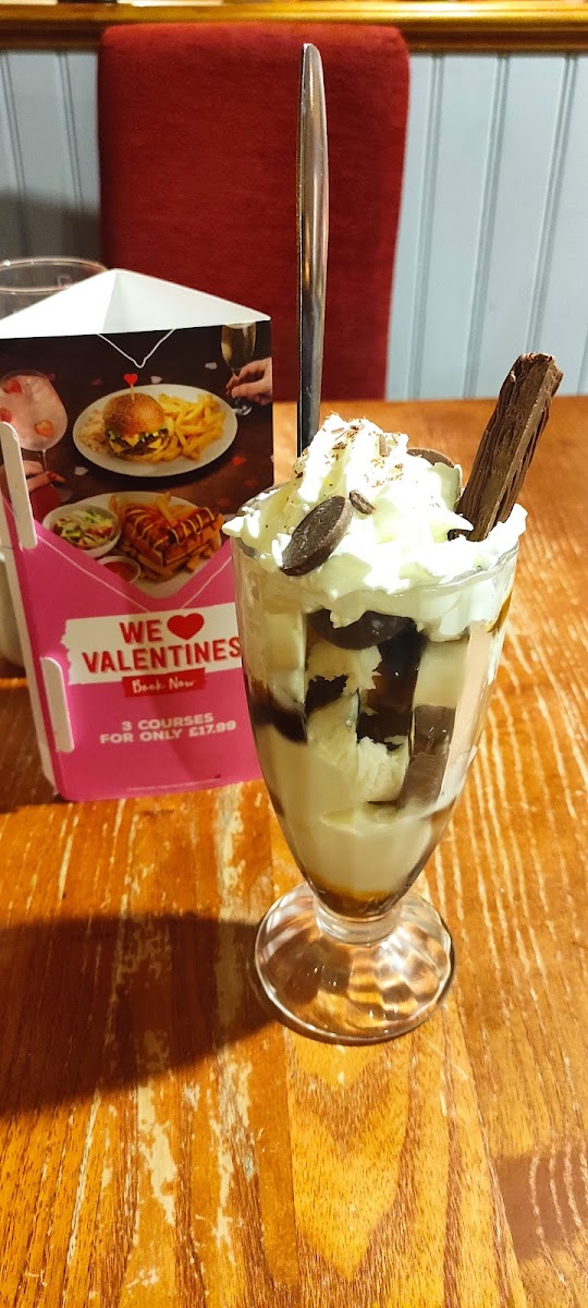 Served warm with vanilla ice cream and chocolate sauce (645kcal)
